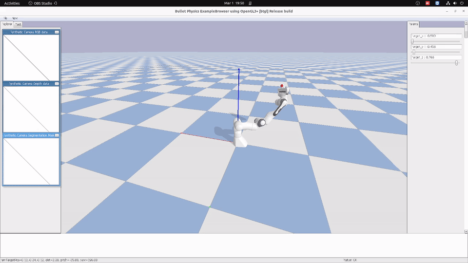A from-scratch implementation of Khatib's Operational Space Control (OSC) formulation for a 7-DOF Franka Panda arm in PyBullet. The controller features task-space PD control with feedforward acceleration, a damped pseudo-inverse for singularity robustness, and null-space posture control to prevent elbow drift. A minimum-jerk trajectory generator provides smooth reference tracking. The system mirrors a real robot control stack with a multi-rate loop: 1 kHz for OSC torque computation and physics, 200 Hz for trajectory updates, and 5 Hz for goal input. Dynamics (mass matrix, Coriolis, Jacobians) are computed via Pinocchio.